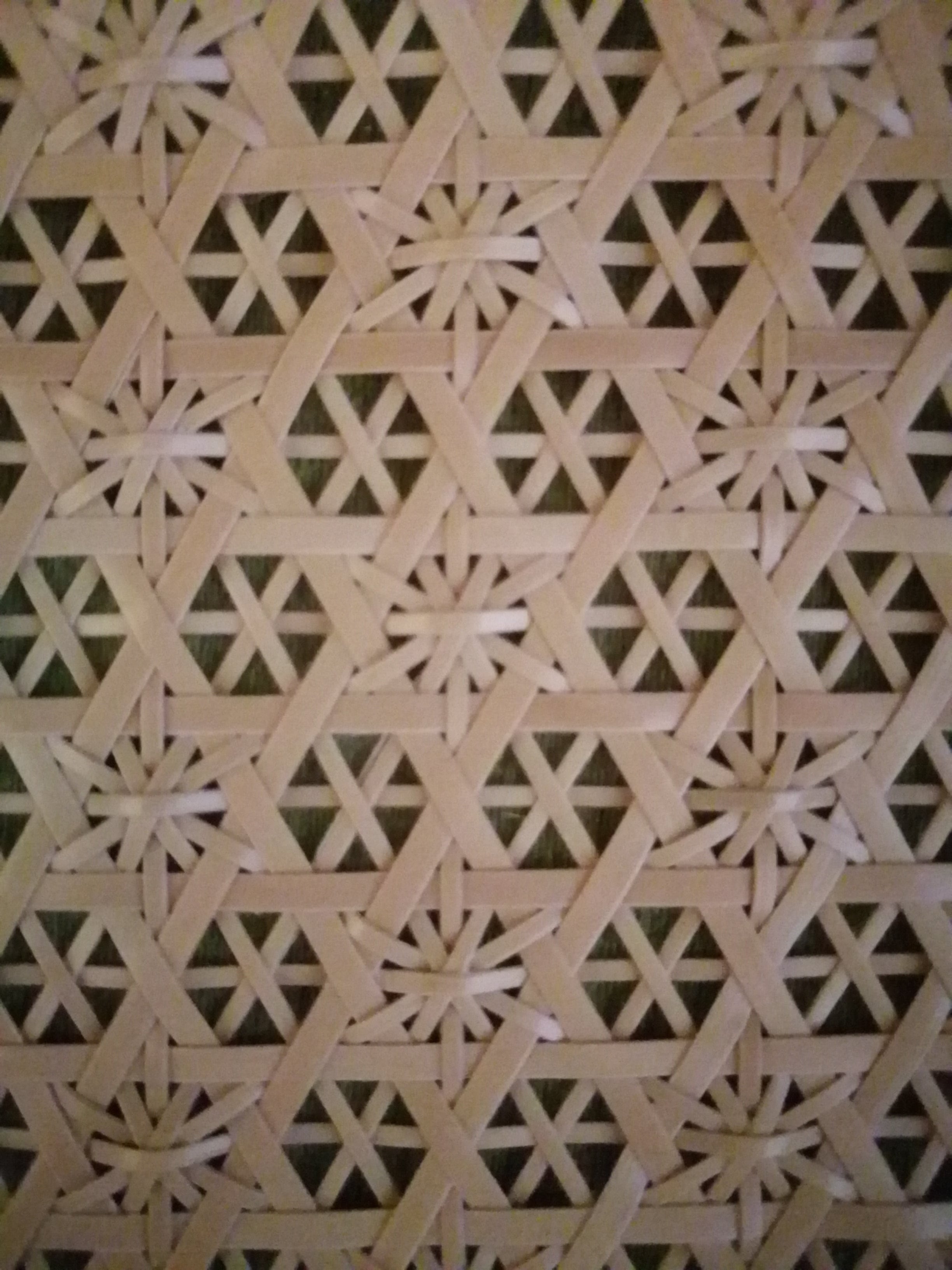 六角形の六つ目編みに細いひごを挿して、立体感のある模様編みに仕上げた竹かごです。