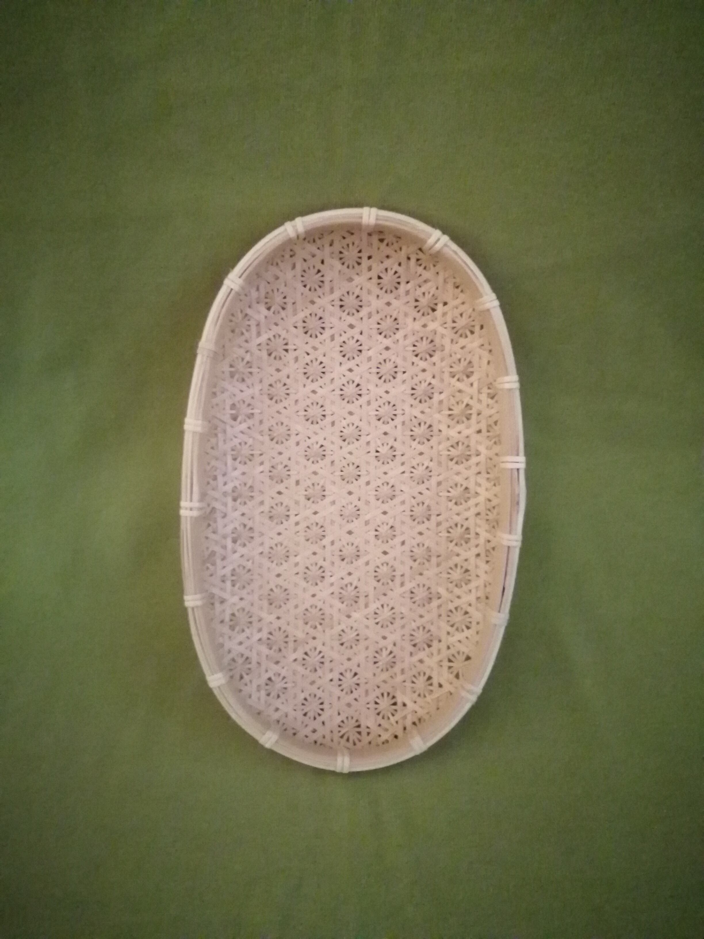 二重六つ目編みに細いひごを挿して、立体感のある模様編みに仕上げた竹かごです。